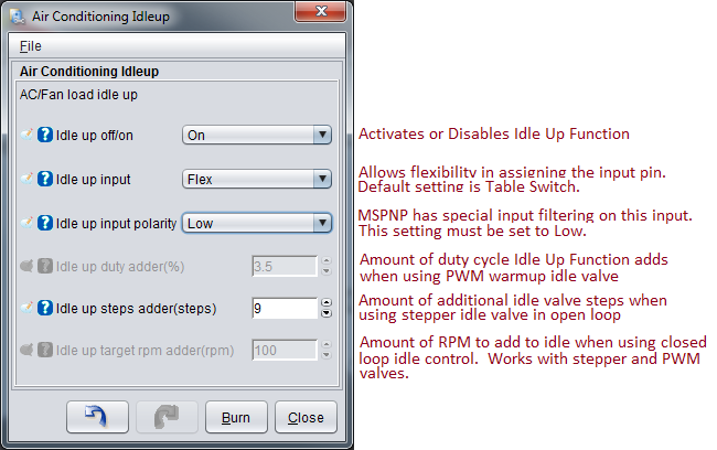 vehicles that were not equipped with such from the factory. MAF/AFM DeleteIn most cases you can remove the factory MAF or AFM from your vehicle to reduce intake restriction and increase horsepower and torque! See your specific MSPNP2 model's addendum documentation for details for your specific vehicle. Wideband O2 Sensor and ControllerThe MSPNP2 supports many common wideband oxygen sensor systems, including the Innovate Motorsports LC-1 and MTX-L products, the Zietronix ZT-2 and ZT-3 (among others), and most other systems that provide a programmable analog voltage output. You will need to install the controller according to the manufacturer's directions and then connect the MSPNP2 to a programmable analog output from the wideband sensor's controller. You should ground the wideband to the engine block near the factory ECU ground wire to ensure an accurate reading. There are two ways of connecting the controller to the MSPNP2. You can either connect the analog output to the pin labeled Oxygen Sensor input of the option connector, or you can cut and splice the oxygen sensor signal wire to the analog output. If you use this pin for wideband input, you must disconnect the stock oxygen sensor. Do not ground the oxygen sensor wire if you disconnect it; leave it completely unconnected and taped off if necessary (make sure it can't short to ground or anything else). After connecting the wideband sensor controller, you will need to change a few settings on the MSPNP2. Section Four has the details of how to change this. Knock sensing (on cars not equipped with factory knock sensors)The MSPNP2 is set up to directly accept input from a knock sensor at the option connector on the back of the box. If your sensor is polarized, wire the positive end to pin labeled Knock Sensor input and the negative end to pin labeled Sensor Ground. Most knock sensors have no polarity and can be wired either way. See section 4 for how to tune the knock sensing circuit. Air Conditioner Idle-Up:The AC Idle up feature allows the engine idle speed to be increased when the AC compressor is engaged.This feature requires the use of either the Table Switch (formerly PE1) or Launch (Formerly Flex) input to function.The input to be used is jumper selectable and is set by default to Table Switch. Minimal tuning of the AC Idle Up feature may be required in order for the AC Idle Up to help maintain stable idle when AC is activated, especially on a smaller displacement engine. Luckily, tuning the Idle Up is very straight forward, however before attempting to tune AC Idle Up, the car must first already be properly tuned. Special areas to note include the VE and Spark tables. Further, an idle valve must be installed, functional, and activated in TunerStudio, and idle control must be stable and smooth with AC off. Both PWM type and stepper idle valves are supported by AC Idle Up, and the feature is available for use with either Open Loop (where a duty cycle or valve position is specified, but a target RPM is not) or Closed Loop (where a target RPM is specified) algorithms. AC Idle Up is activated in TunerStudio under the Startup/Idle tab > Air Conditioning Idleup. The graphic below shows the Idle Up dialog box and outlines the settings.