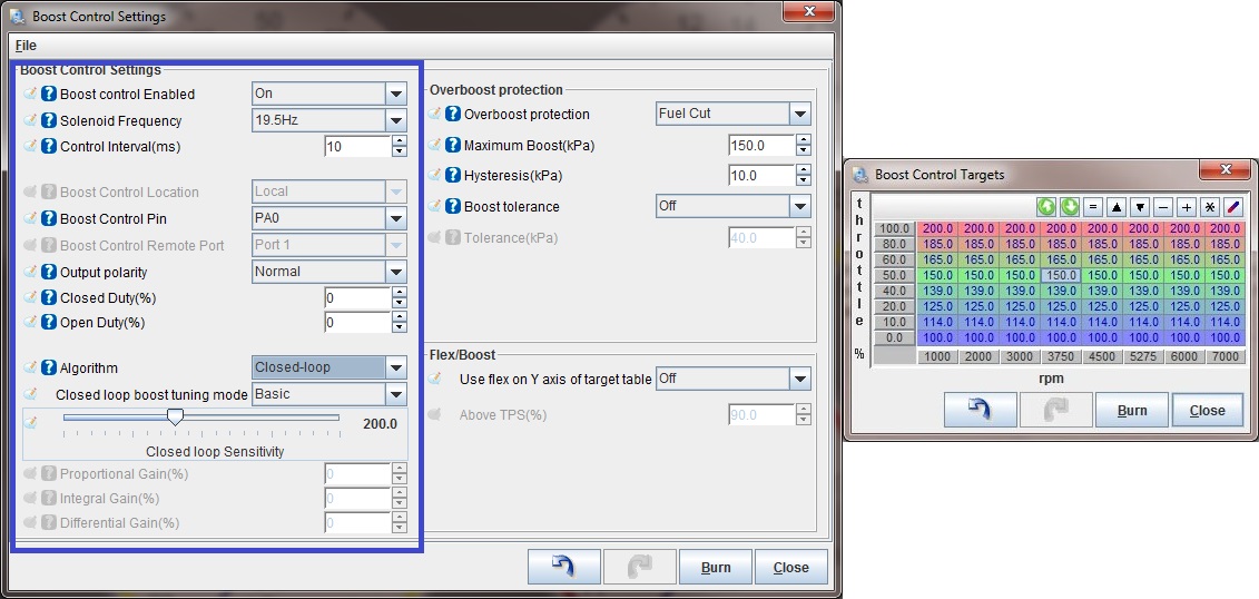 Burn this and try it. See if your boost increases ANY at all over your waste gate only boost levels. Then slowly raise the whole table maybe 5-10% at a time (again, multi-select and fill the whole table is the easy way). Burn it and test it. Datalog this and compare how much boost you made to the prior pull. The pulls need to be in the same gear with all conditions identical, preferably on a dyno, though a track could work if you have a long consistent straight that you can pull 3rd or 4th gear from before the turbo spools (maybe 2000rpm) on up to redline, repeatedly, in a safe environment. You're looking for when you start making more boost. When you do then you can start fine tuning at different RPM ranges. Adding a little more here, pulling a little out there, moving around the RPM columns to make it do what you want it to do, reviewing your logs in MegaLogViewer to see what the results of each pull are. Notice in our example table below, we've got 100%DC in the first column. That's an attempt at making the turbo spool as fast as possible. The GT2560 turbo in our 91 Miata shop car is fully spooled to 13.7psi by about 3500rpm. In order to keep it from spiking though we had to bring the duty cycle way down to 45 by 3200 rpm, then after that we just 'gave it what it needed' to keep the boost at about 13.7psi across the rest of the rpm range all the way to redline. You can see in this table at higher revs it took less DC as the turbo was wanting to make more boost so we had to pull the boost controller back some to control it. Bottom line, start at low duty cycles, make small changes, and analyze the results of each pull. Remember that as you add boost you're getting into previously untuned areas of your fuel and spark tables and you'll need to adjust those as you go. If your car has a variable TPS (throttle position sensor) then you can also adjust open loop boost duty cycle based on throttle position, making the waste gate increase or decrease boost at lower throttle positions. Typically you'd reduce DC at lower throttle positions, such as in the cruising speed range where you don't want the turbo boosting to the moon. Tuning Closed Loop Boost ControlWe recommend tuning the open loop boost control before you attempt to tune closed loop boost control. To tune closed loop boost control, first set up the boost control target table. You will enter the desired kPa reading as a function of throttle position and RPM. You should not enter in any values lower than waste gate pressure as the valve cannot reduce boost any further, your mechanical wastegate's pressure is the baseline and can only be added to by electronic boost control. Next you will tune the PID values under Boost Control Settings to make it better hit these targets.