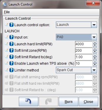 Rev LimiterMSPNP2 incorporates a two stage rev limiter, accessible under Basic Setup → Rev Limiter. The soft rev limit simply pulls the amount of timing listed as Maximum Retard from the timing table, while the hard cut can shut down the ignition, fuel, or both. This behavior is all configurable on this screen. You choose whether you want fuel cut, or spark retard at a certain RPM followed by fuel cut a couple hundred RPM higher, or any number of possible configurations. The latter is probably the most common configuration, allowing the power to drop off just before redline, and then fuel cut at whatever redline you choose. Note that a fuel cut will not run your engine lean, it will completely CUT the fuel so that no fuel is flowing. This has proven to be a safe method for use as a rev limiter on N/A and forced induction vehicles. As a general rule, you should only use the spark cut rev limiter by itself if the car is not equipped with a catalytic converter. Cars with catalytic converters should use the fuel cut rev limiter, either on its own or in combination with spark cut. Turning off the ignition without cutting the fuel will dump raw fuel into the exhaust and can damage the catalytic converter. Launch ControlThe launch control is based on a rev limiter. This is configured from the Boost/Advanced → Launch Control Control dialog. Often the best way to control this is with the stock clutch switch which opens/closes a circuit based on the clutch pedal position. Note that often this circuit also runs through the neutral safety switch on manual transmission vehicles. This means that if you turn launch control on using the stock clutch switch, it will activate when the transmission is in neutral or when you push down the clutch. So when the trans is in neutral, you'll have a launch control rev limiter. When you push in the clutch and put the trans into first gear, you'll also have a launch control rev limiter (which is when you want it) every time after you first put the car in gear and take your foot off the clutch. When you have the launch control active, the rev limits drop to the limits specified on the launch control screen, letting you rev the engine up to a fixed RPM that you can adjust. When you release the switch, the rev limit is removed and you take off nice and controlled.