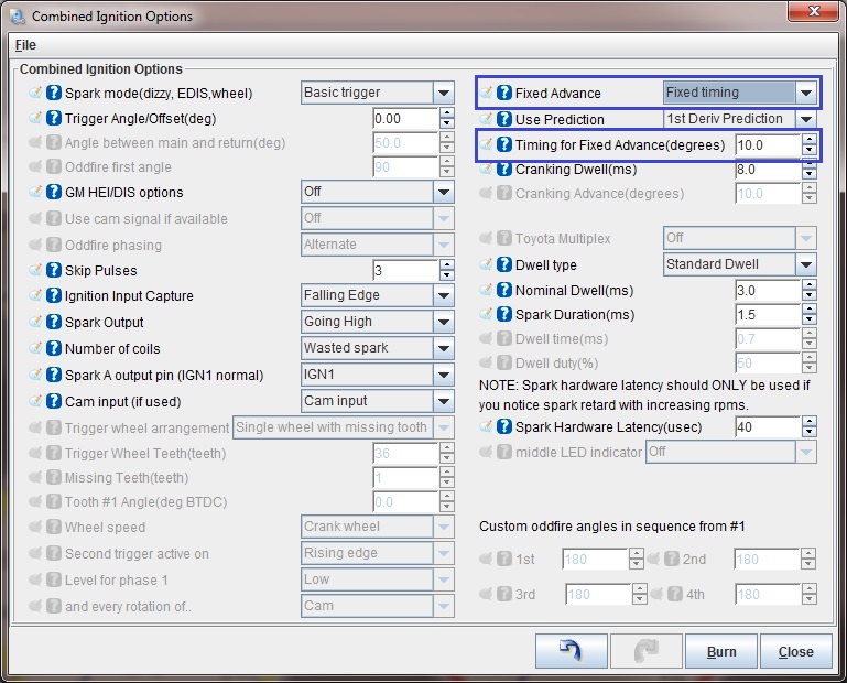 Settings that should not be changedThe MSPNP2 does not lock you out of any of the settings. As the core MegaSquirt EMS platform is very powerful and designed to work on just about any engine running just about any sensors and ignition system available, there are several settings used to configure the ECU in order to allow the use of these sensors and ignition systems. These are critical settings, and installing a non-PNP MegaSquirt EMS must be researched and configured for each vehicle. We've however taken the guesswork out of this with the MSPNP2, and you DON'T want to change these settings. We've configured the MSPNP2 for your ignition already, and changing some of these settings could cause your MSPNP2 to stop working with your engine, or worse, could even damage your engine or electronics. In addition, there are several settings and options for features not enabled on the MSPNP2. Here are some areas which you should not adjust, as well as some settings that should only be adjusted if you have modified your ECU to enable them. Ignition Settings you don't want to touch unless you know what you're doingWith stock ignition system components (crank and/or cam trigger wheels, ignition coils, ignitors, etc.), many of the ignition settings need to be left as they are. The only reason to adjust any of the ignition settings (including trigger wheel settings and rotary settings) beyond the spark table are to set the base timing, which you must always do once prior to driving your vehicle on the MSPNP2. If you are changing the type of coil you are running to an aftermarket coil or ignition module (ignitor) you might need to change the dwell settings. One other scenario in which you might need to adjust these is if you are converting from a distributor to a distributorless ignition. Fuel Settings you don't want to touch unless you know what you're doingDo not enable PWM current limiting for the injectors - the MSPNP2 firmware just ignores this as it's not needed with the addition of the Peak-N-Hold injector circuitry integrated into your MegaSquirtPNP. Changes to the staged injection or sequential parameters may only work if you have made the appropriate changes to the injector wiring. This is getting away from the PNP (Plug-N-Play) aspect of this product by allowing you to upgrade your ignition system and fueling beyond what the factory allowed for, and is of course not required to use the product on a vehicle with a stock ignition and fuel system. Input and output ports, such as those under the Output Port Settings, Boost Control, and Tacho Output, are hardwired and should not be changed except as specified in the manual. There is also a reference to nitrous control, although nitrous outputs are not installed on the MSPNP2. (You may, however, use the table switching input to use a different fuel and spark table for nitrous.) Idle Control Valve Settings you don't want to touch unless you know what you're doingYou also do not want to change the settings for the type of idle valve unless you actually change out your idle valve to a different valve. We've pre-configured the base idle valve settings to control the factory idle valve on your vehicle's engine. While you may need to fine tune the closed loop control settings, or the PWM Warm-up settings, you don't need to change the base configuration such as the idle valve frequency. Settings you DO want to change/tuneVerifying and Adjusting Base TimingBecause the factory ECU is no longer in control of ignition timing, it will be necessary to make checks to ensure the MSPNP is accurately delivering the proper timing. Improper ignition advance can cause engine damage if improperly set or is left unchecked. The MSPNP will have a base ignition map loaded and ready to use. However, it is necessary to ensure that the timing advance being commanded by the MegaSquirt is in sync with what the engine is actually seeing. These steps will require the use of a timing light and a laptop with a copy of TunerStudio running.
