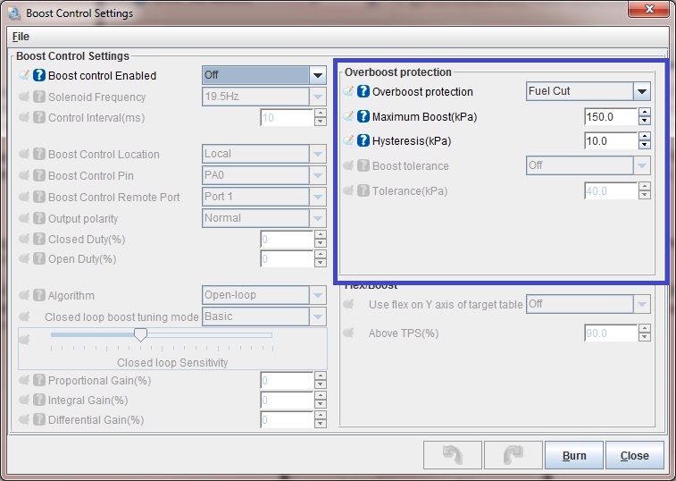 The MSPNP2 is equipped with a 4 bar MAP sensor, so the maximum amount of boost it can read is 44 psi of boost. While higher amounts of boost will not damage the sensor in most cases, it can damage your engine if you do not tune for it. The MSPNP2 will not know to add any more fuel above 44psi to compensate because it cannot detect the extra air/pressure, which can result in dangerous lean conditions if you boost beyond that point. If you need a MAP sensor capable of reading higher than 44psi please contact our tech support, we can help! Since MSPNP2 is a speed density system, you do not need to recirculate the air in the intake (though you can if you want to). If you prefer, you can go ahead and install a monster blow off valve and vent it to the atmosphere without worrying about having it throwing off your measurements. Overboost ProtectionOverboost protection is available under the Extended menu. The MSPNP2 base map for factory naturally aspirated vehicles has a default Overboost Protection limit set of 150 kPa which is a bit above 7 psi (depending on ambient pressure in your area). This limit is there to prevent an overboost condition and to protect your motor. If you've added a supercharger or turbocharger to the engine you'll need to adjust this limit to be a bit above the amount of boost you want to run. When the threshold is reached, injector PW (pulse width) will be cut to 0 for a split second until MAP (manifold pressure) drops back below the limit if overboost protection is turned on (and configured to fuel cut, which is typically how it would be setup). Therefore with the default settings on a factory naturally aspirated vehicle, if you try to boost too near to 150 kPa you will feel the engine cut out when Overboost Protection kicks in. This can feel like a single cut, or it can feel like the car is erratically cutting out and bucking if you stay on the throttle and continue to bounce off the limiter. The Hysteresis value lets you determine how far the boost pressure has to drop before the overboost protection is turned off allowing the injectors to fire again. This 150kpa Overboost Protection limit, and the hysteresis, are very easy to configure in the tuning software on the Overboost Protection dialog under the Extended Menu in TunerStudio MS. NOTE-- for factory forced induction cars (supercharger or turbo) the default boost cut limit will vary by model. Typically this will be about 20% above the factory boost levels normally seen on the vehicle model. Please see the vehicle specific docs for your MSPNP2 model/vehicle for further details on the default limit on your car. Tuning is the same as above.