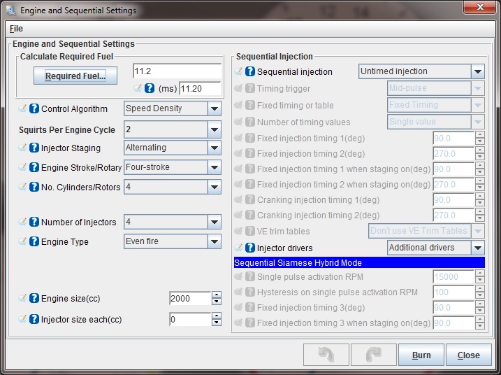 Settings to Change for Modifications (injectors/intake/exhaust/cams/boost/etc.)Many mods will simply require tuning the VE and spark tables to fit. Modifications to the sensors and fuel system, however, require specific changes to the settings. Here are the recommended changes for some common modifications. Fuel Injector CompatibilityThe MSPNP2 can drive a wide variety of injectors, including both high and low impedance. Note that the MSPNP2 ECU's case will run slightly warmer when controlling low impedance injectors. This is normal and nothing to be concerned about. Changing to a different Fuel Injector SizeWhen you change the injector size, MegaSquirt can handle most of the adjustments with just one variable, Required Fuel (aka REQ_Fuel), which sets the base pulse width. TunerStudio can calculate this value automatically for you. To do this, open Basic/Load Settings → Engine Constants → Required Fuel. From there you just need to enter your engine size, number of cylinders and injector size, as well as 14.7 for the air/fuel ratio. Don't be concerned if the info in this dialog doesn't match you engine when you first open it up, it doesn't store your info here, just uses it to calculate the new REQ_Fuel number.